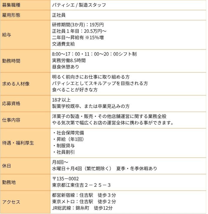 専門学校在籍中の方、熱意のある未経験者の方、ぜひ私たちと一緒にケーキ作りにドッポリ浸かってみませんか?
